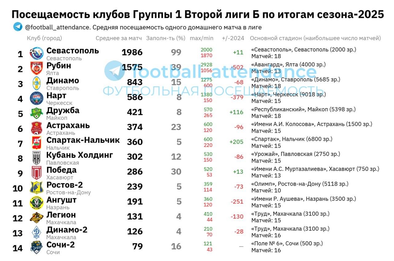 • 3 из 14 участников Группы — вторые/молодёжные команды. Без участия «двоек» средняя посещаемость Группы составила 641 зр./матч.
