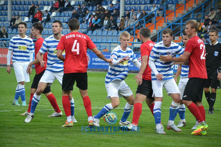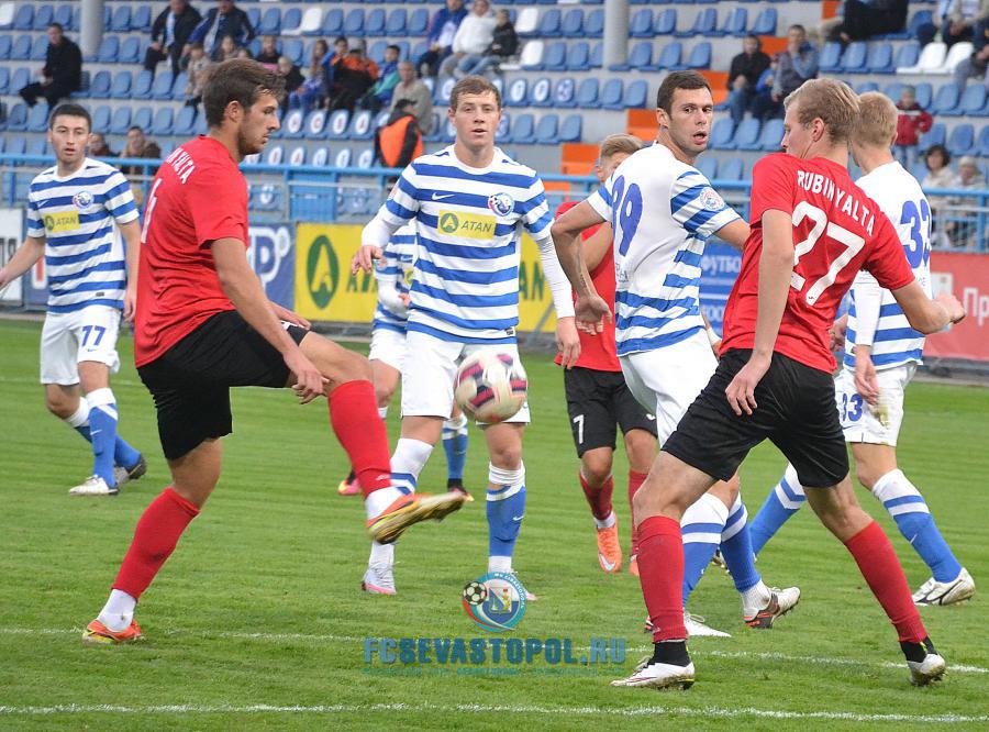 | 2' | | Севастополь играет в бело-голубой полосатой форме. Ялта в красных майках, черных трусах |