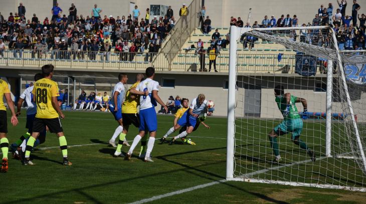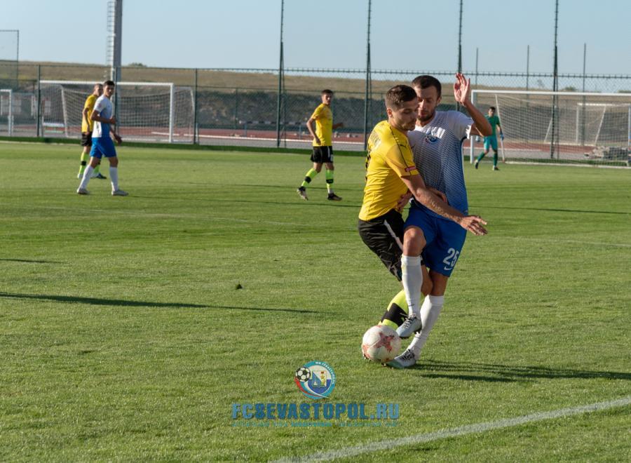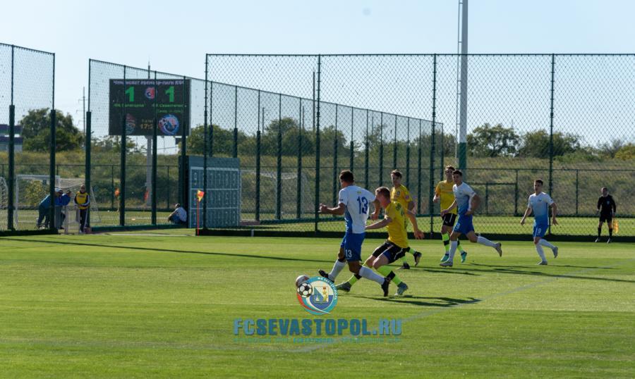 «Севастополь» с первых минут поединка старался играть первым номером и довольно быстро преуспел в этом. На 11-й минуте наша команда повела в счете. Гости продемонстрировали домашнюю заготовку в виде розыгрыша углового. Дмитрий Матвиенко навесил мяч на ближнюю штангу, Петр Опарин головой переправил его на дальнюю, где в падении головой передачу замкнул Матвей Гуйганов – 0:1.