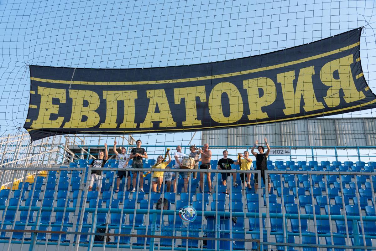 Первый тайм прошёл в равной борьбе, но наша команда была ближе к тому, чтобы выйти вперед. На 27-й минуте после подачи углового Андрей Кива, находясь в штрафной площади под острым углом к воротам, опасно пробил под перекладину, но защитник в последний момент головой выбил мяч за пределы поля. На 28-й минуте после навеса Андрея Кивы со штрафного Олег Солович оказался на углу вратарской первым на мяче и головой пробил в нижний угол ворот – к сожалению, прямо в руки голкиперу Владиславу Суслову. «Евпатория» имела шанс отличиться перед самым перерывом. На 45+2-й минуте Юрий Максимов продавил нашу оборону на левом фланге, вошел в штрафную и отдал передачу в район одиннадцатиметровой отметки на набегавшего Дмитрия Литвинова. У полузащитника команды-гостей удар не получился, и мяч вышел за пределы поля.