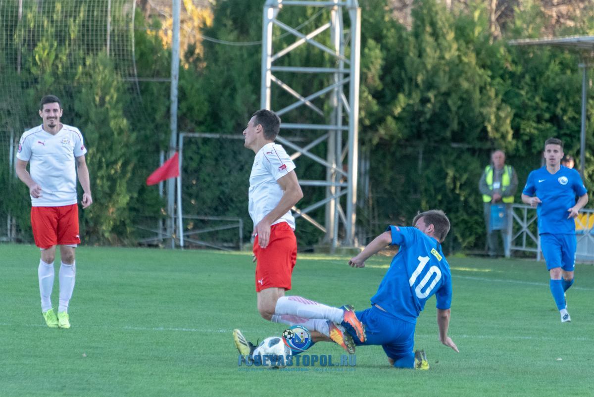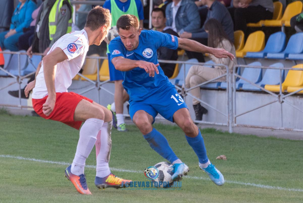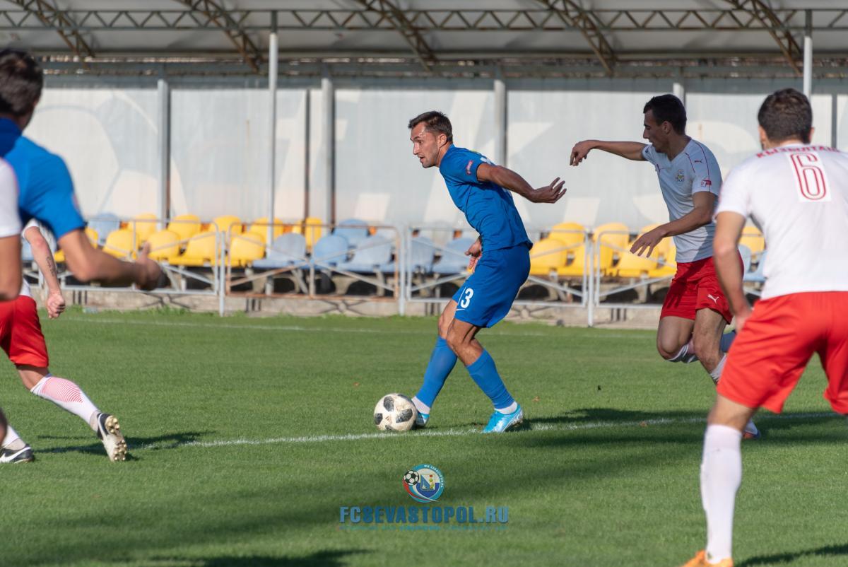 Наговицын подобрал мяч в штрафной Севастополя и побил низом в дальний угол. Мяч немного разминулся с воротами
