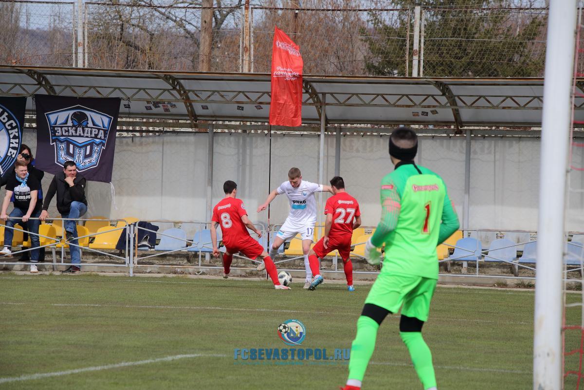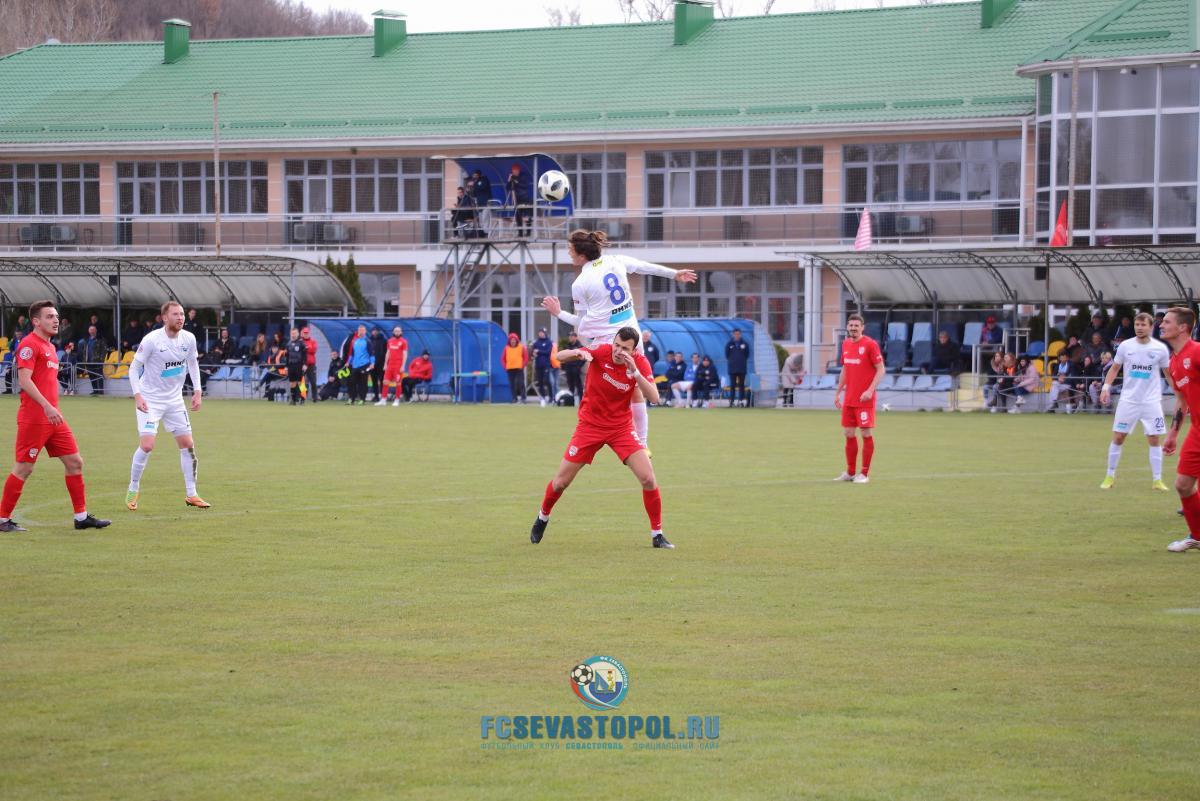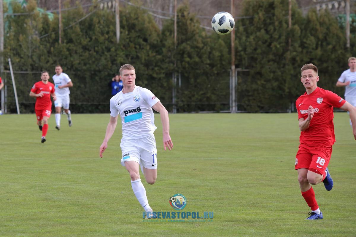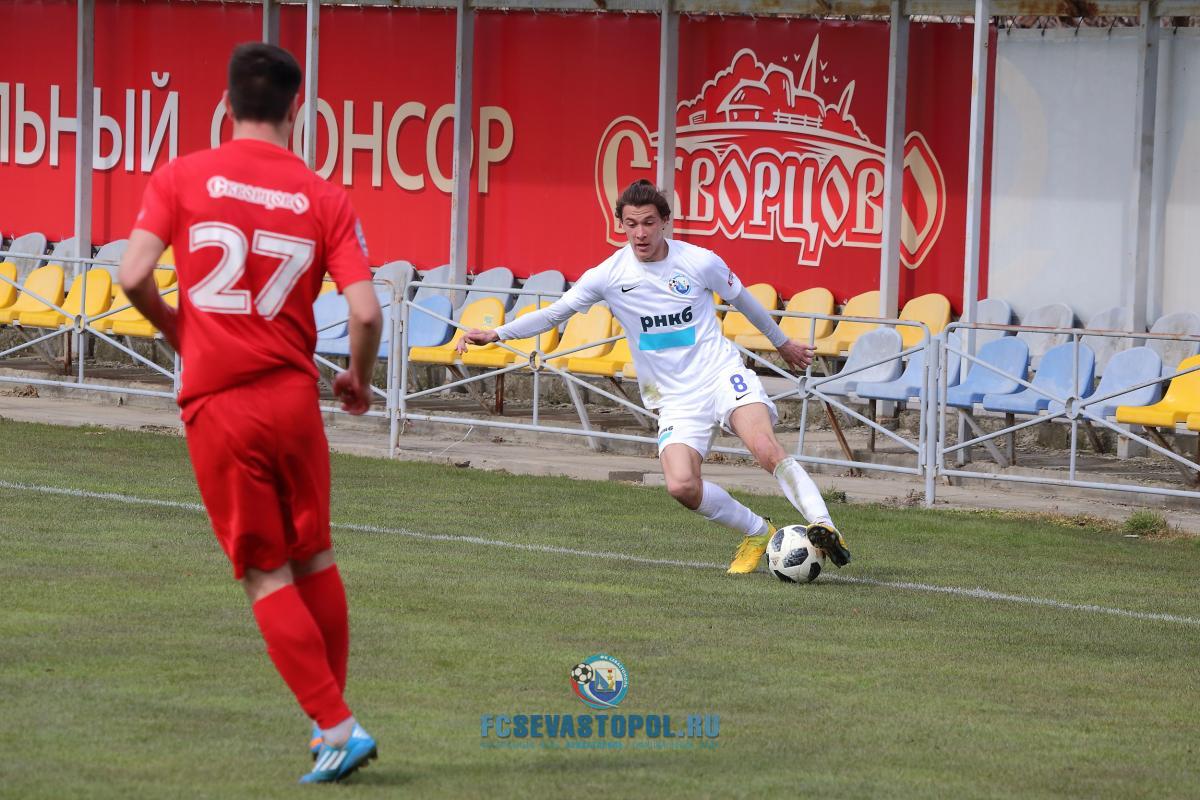 Наша команда, как и подобает лидеру, играла первым номером, и на 35-й минуте заслуженно повела в счёте. После навеса со стандарта выше всех в центре штрафной выпрыгнул Захар Тарасенко, и головой переправил мяч в дальний от Азамата Томаева угол ворот – 0:1. Нападающий «Севастополя» имел шанс отличиться тринадцатью минутами ранее, но выйдя один на один с голкипером «Гвардейца», не смог переиграть его.