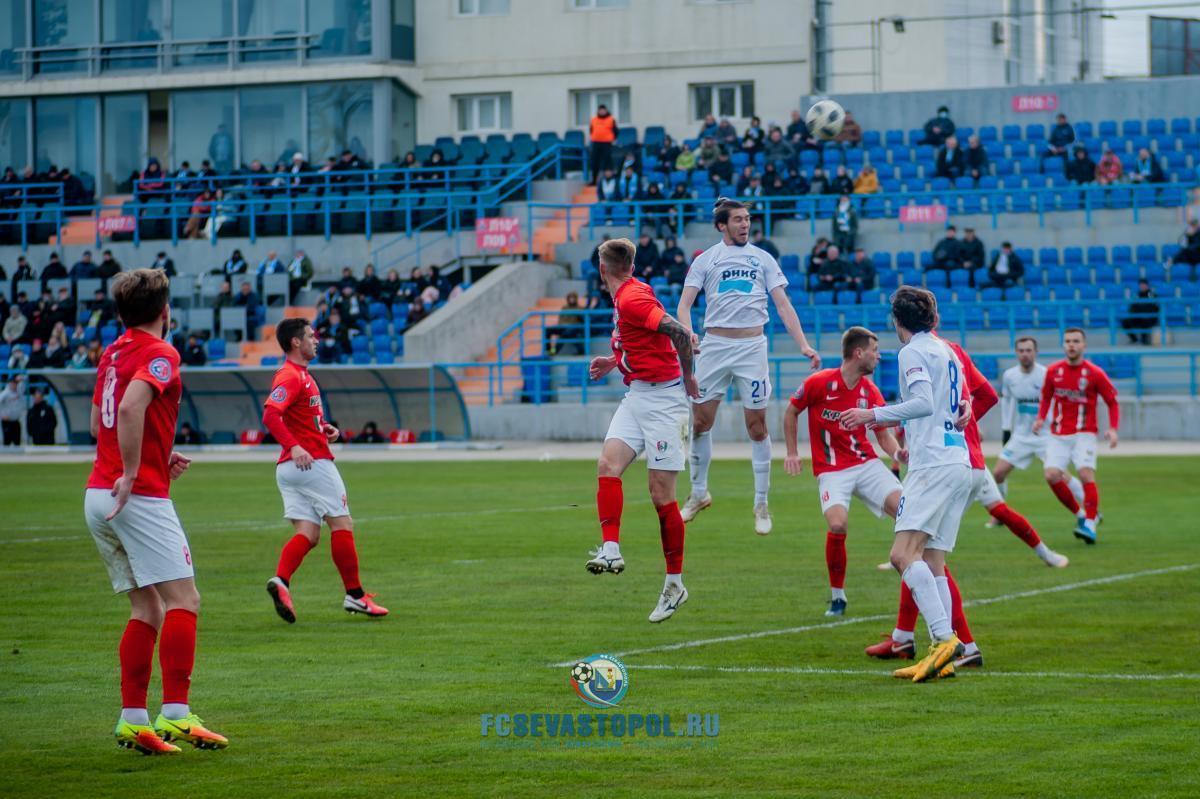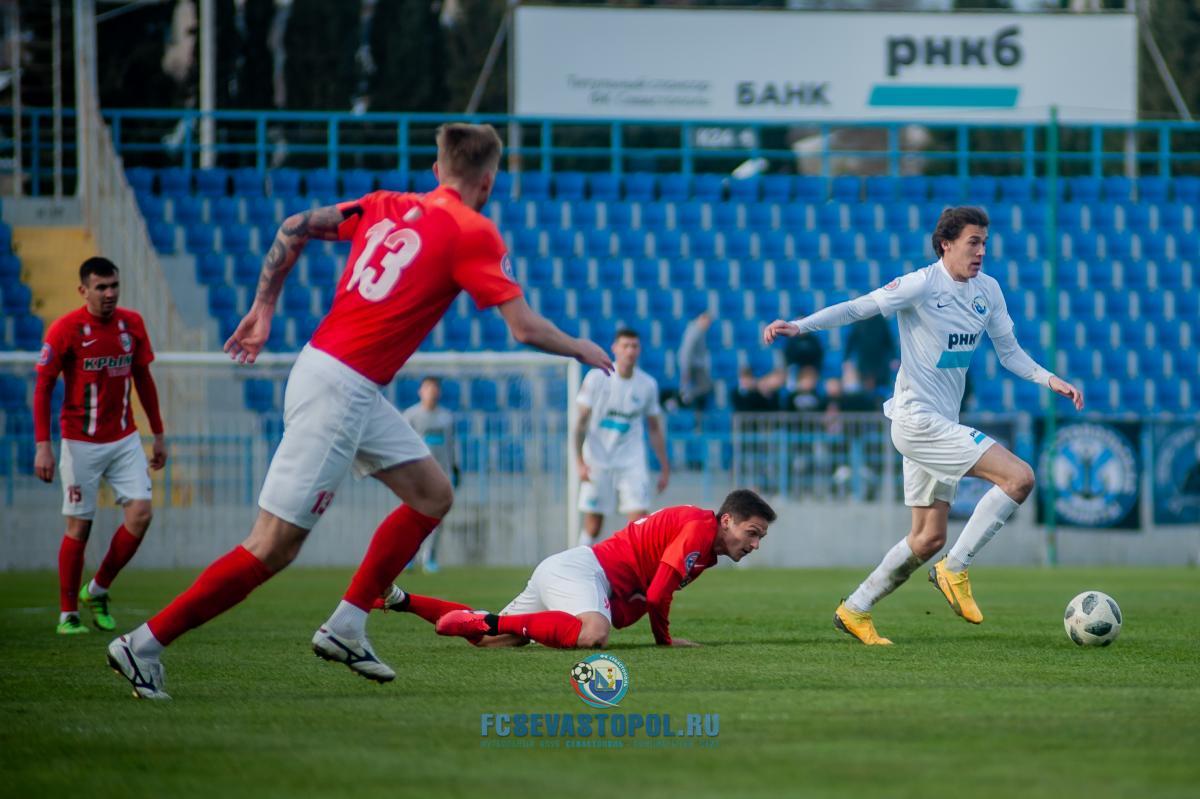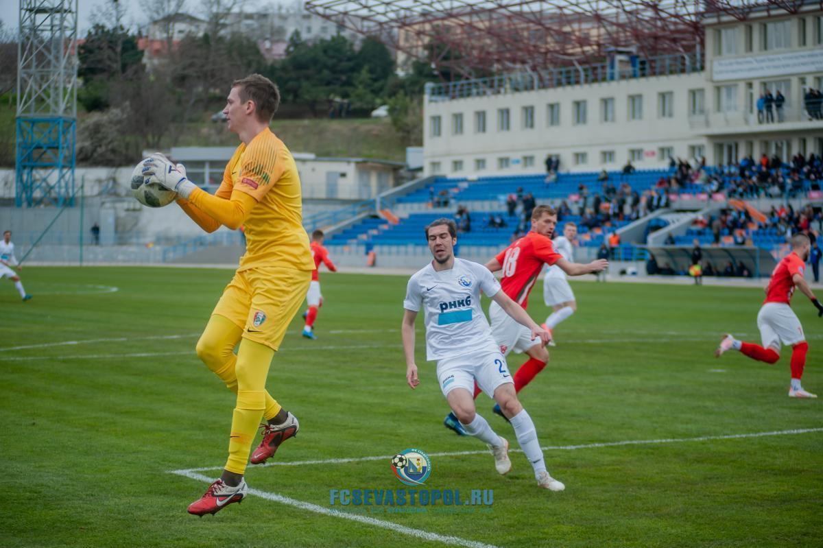 Севастопольцы повели в счёте уже на 14-й минуте. Мяч, забитый Александром Смирновым, будет претендовать на лучший гол месяца, и не только потому, что он вколотил его эффектным ударом в верхний угол ворот, но и благодаря комбинации, начатой на левом фланге Максимом Супруном и продолженной Андреем Кивой, навесившим мяч в штрафную на Матвиенко. Дмитрий отлично разобрался в ситуации и головой отбросил мяч на набегавшего Смирнова, которому ничего не оставалось делать, как отправить его в сетку ворот, – 1:0.