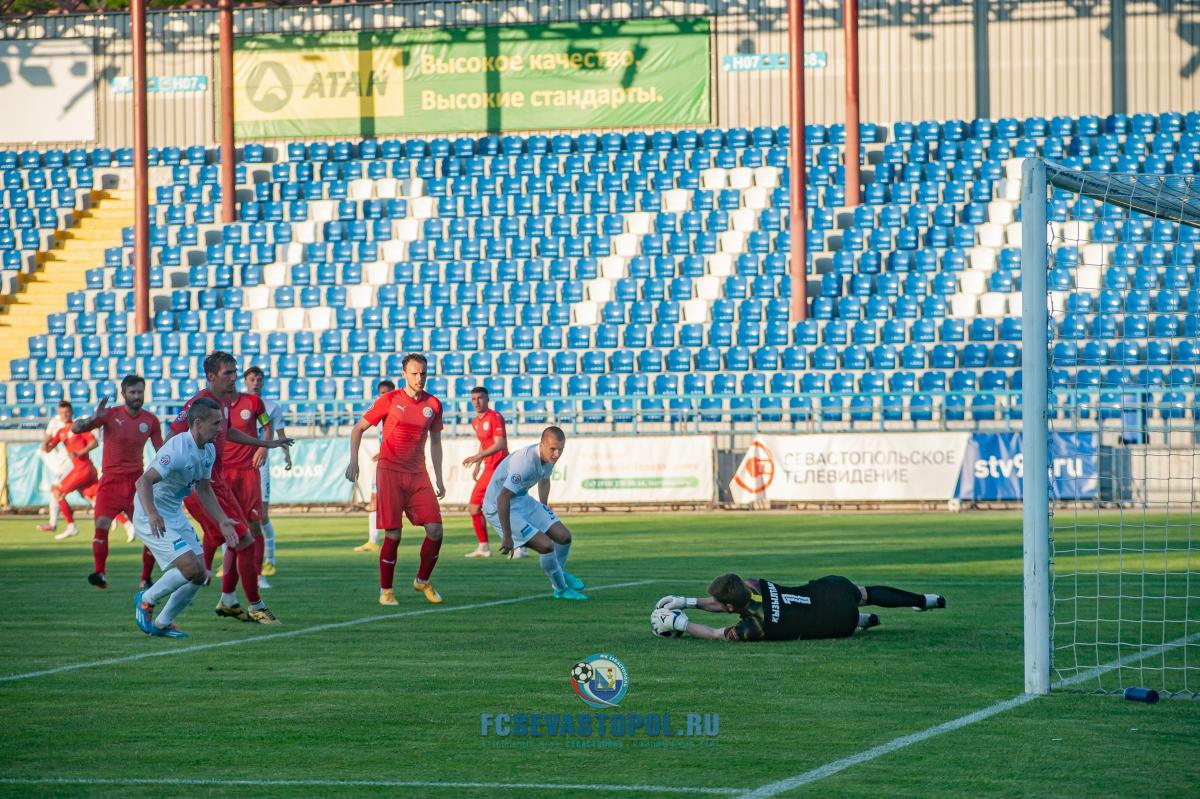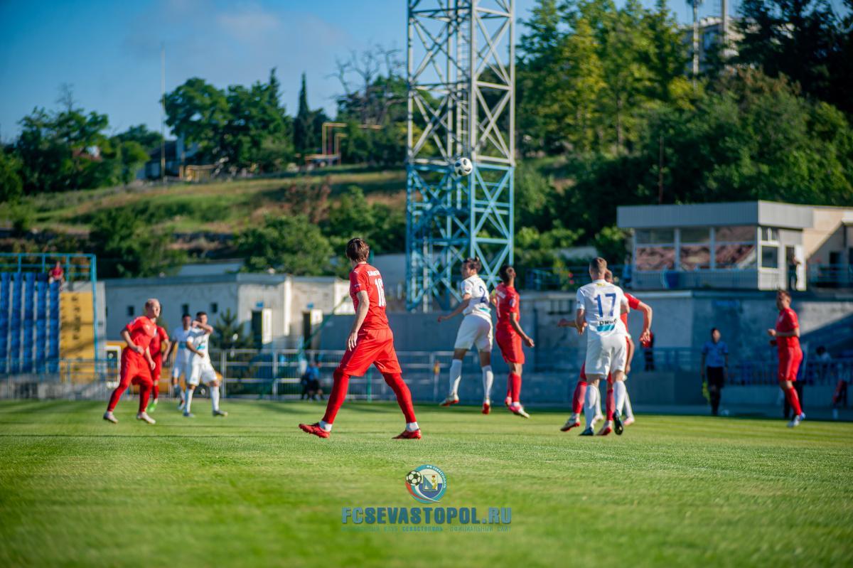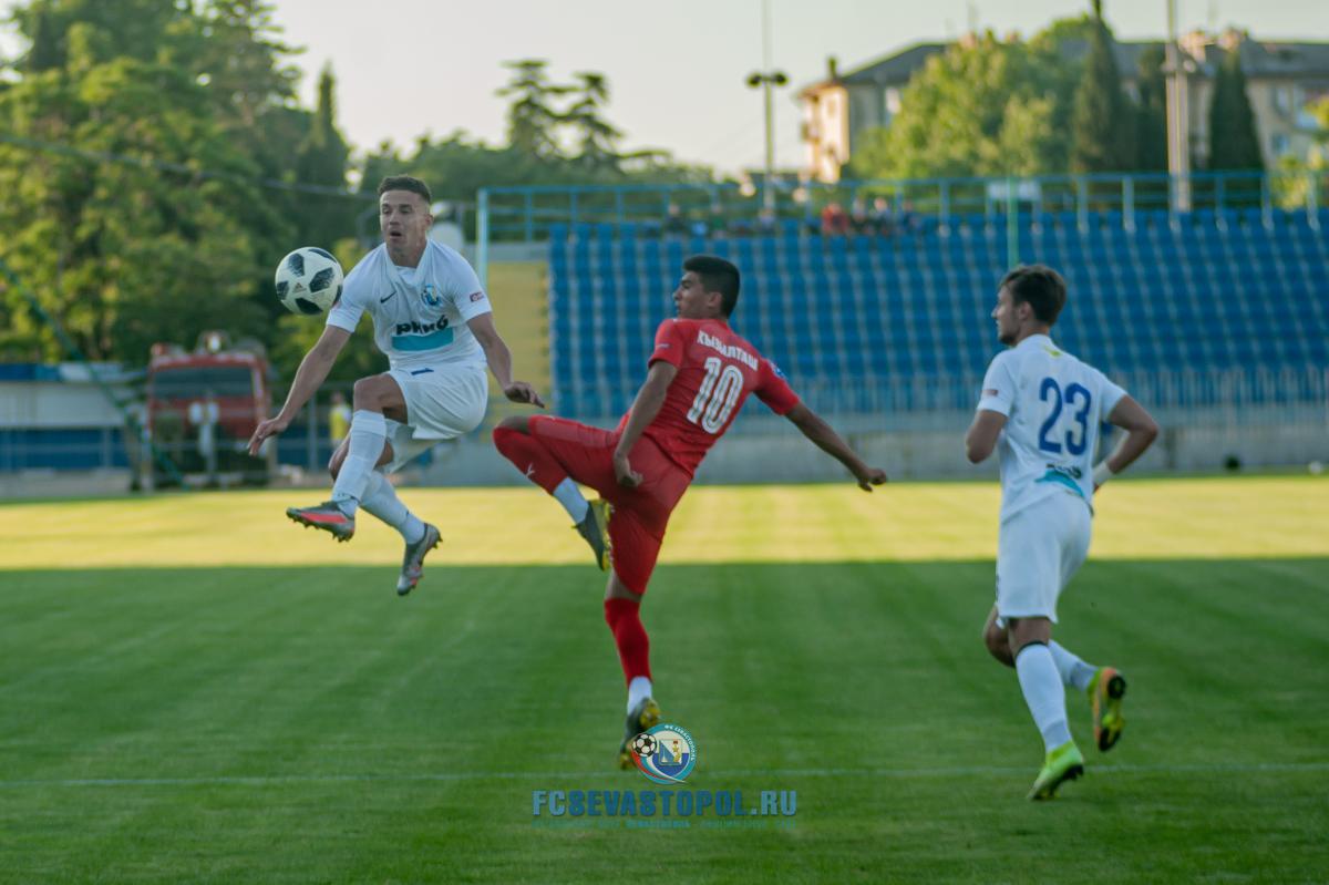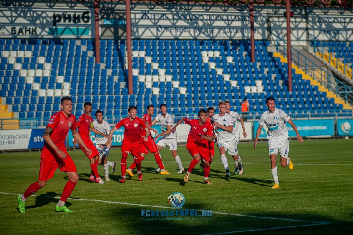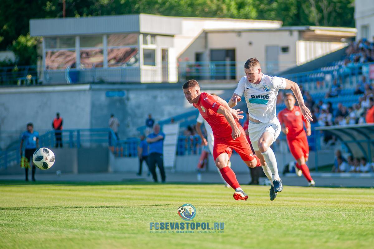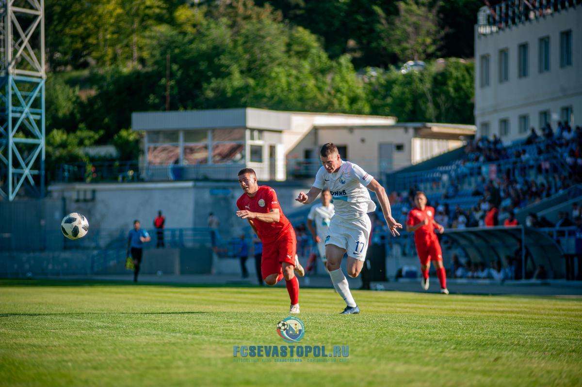 В итоге соперники выдали потрясающее футбольное зрелище с шестью забитыми мячами, двумя отменёнными голами и массой опасных моментов у ворот друг друга. Первыми открыли счёт хозяева поля и сделал это на 22-й минуте игры Артур Айметдинов. Забитый мяч обеспечил Артуру победу в номинации «Лучший бомбардир» по итогам чемпионата с результатом – 19 голов, что является рекордом Премьер-лиги КФС. Гости к концу первого тайма смогли сравнять счёт после мощного удара из района одиннадцати метров Владислава Алексина в верхний угол ворот «Севастополя» – 1:1.