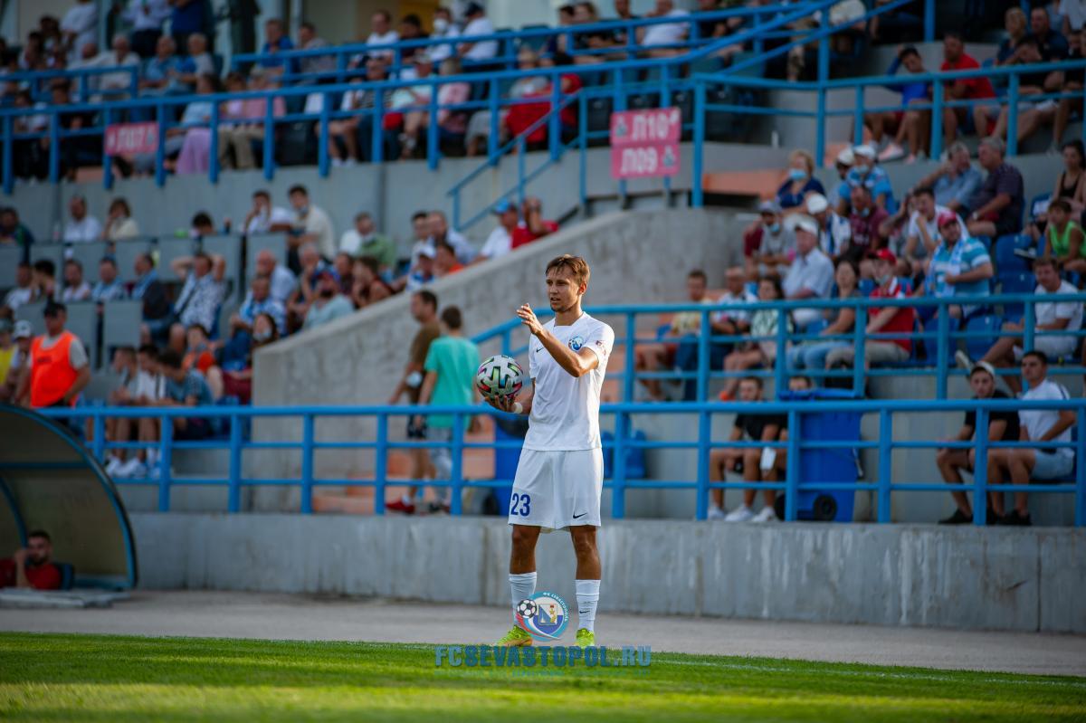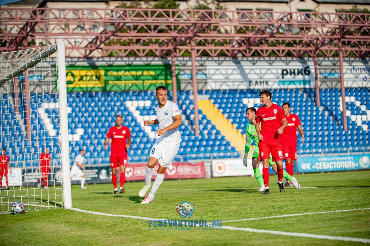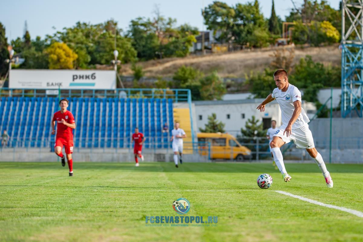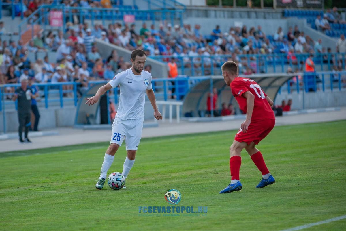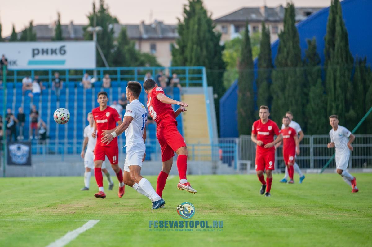 Наша команда вышла на матч предельно собранной и заряженной на позитивный результат. К радости болельщиков, практически заполнивших центральную трибуну стадиона, севастопольцы открыли счёт уже на 3-й минуте. После навеса с фланга Дмитрия Матвиенко на выходе ошибся голкипер «Гвардейца», и лучший бомбардир предыдущего чемпионата Артур Айметдинов в одно касание отправил мяч в нижний угол ворот соперника – 1:0.