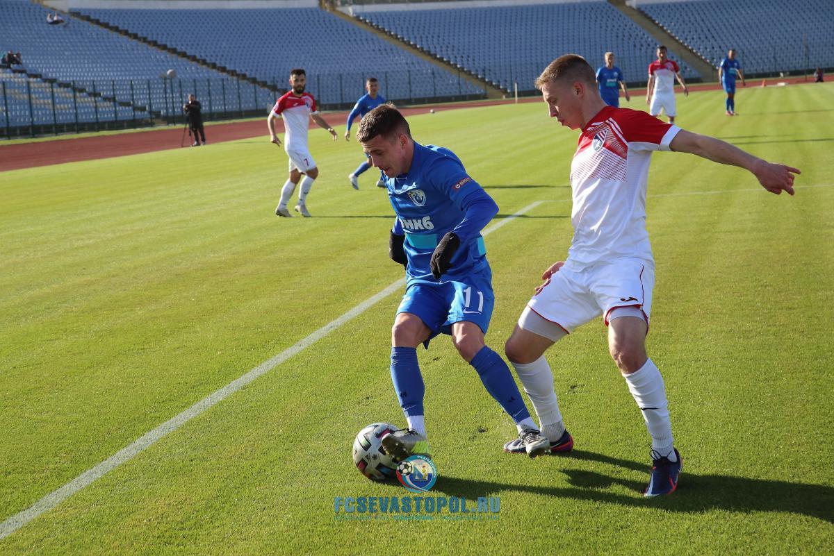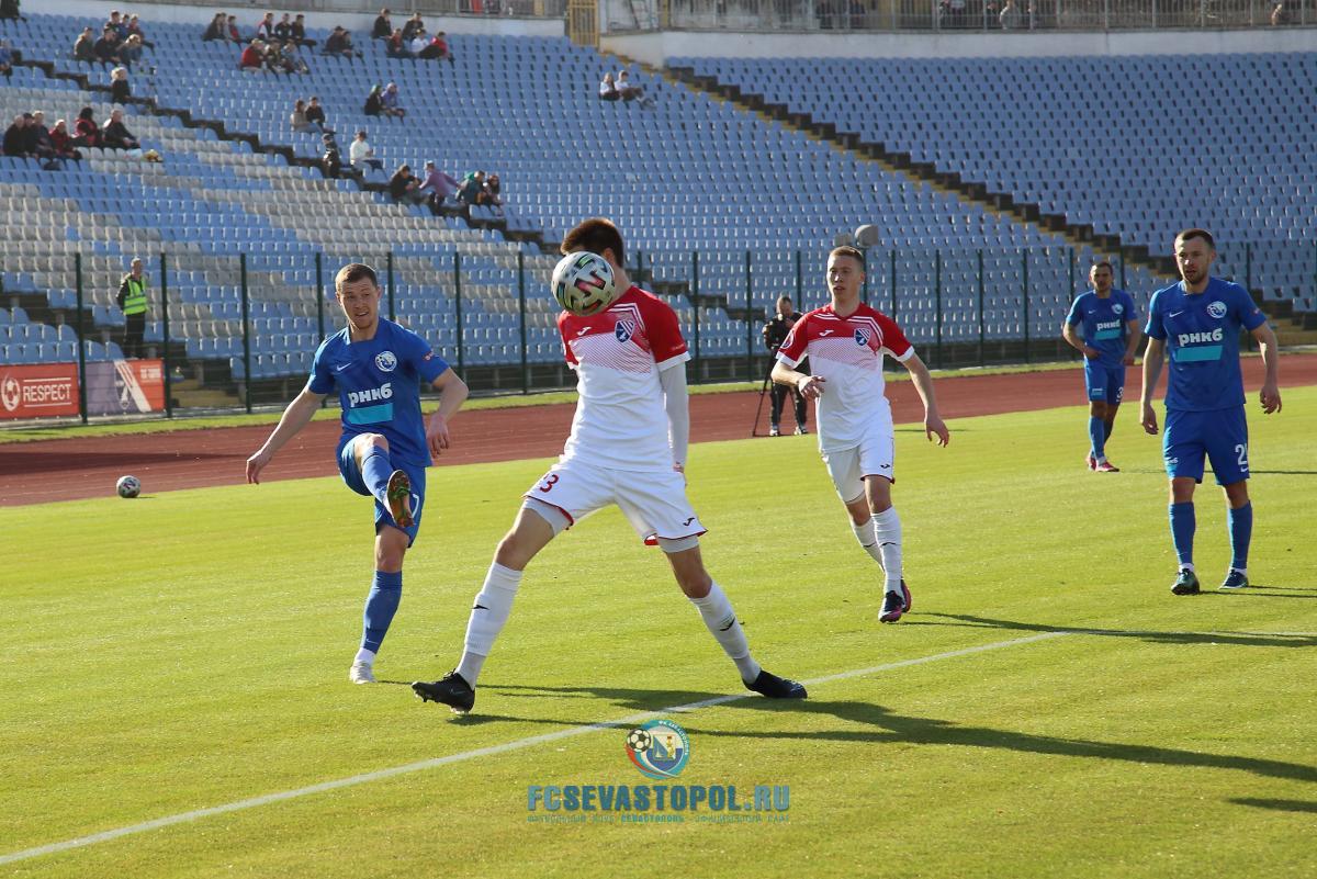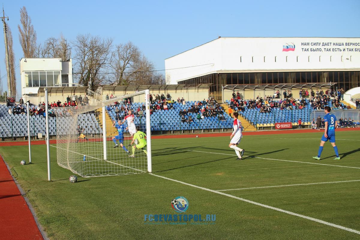 Подопечные Станислава Гудзикевича доминировали с первых минут матча и уже к перерыву выигрывали с преимуществом в два мяча. Впрочем, игровое преимущество севастопольцы воплотили в гол лишь на 22-й минуте, когда Антон Голенков откликнулся на подачу Романа Климентовского на угол вратарской и в падении ударом головой оставил не у дел голкипера хозяев поля. На 37-й минуте аналогичный гол забил Матвей Гуйганов, только бил он из района одиннадцатиметровой отметки, а ассистировал ему Голенков.