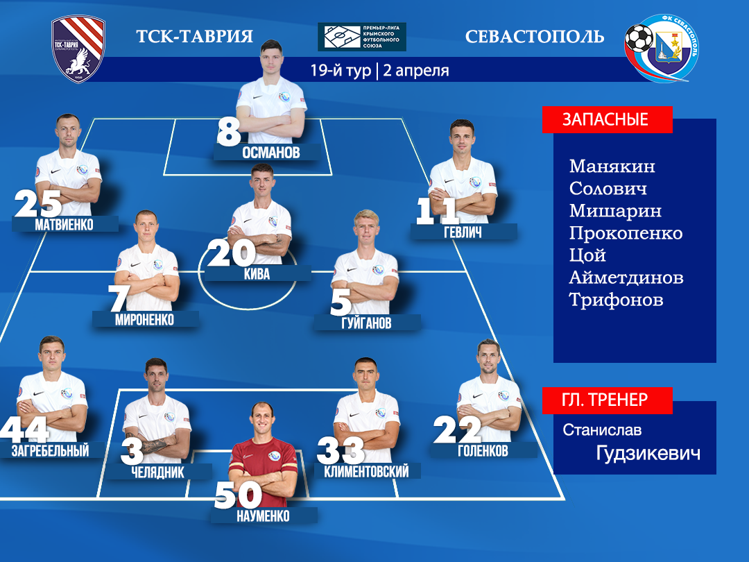 Матч 19-го тура чемпионата Премьер-лиги КФС «ТСК-Таврия» – «Севастополь» пройдёт 2 апреля (суббота) на стадионе Центра спортивной подготовки сборных команд Республики Крым. Начало в 16.30.