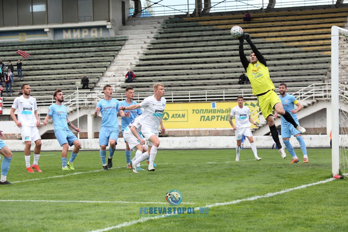 С первых минут встречи гости повели игру в своём излюбленном ключе – быстрые фланговые атаки с навесами в штрафную, где в завершающей фазе способен результативно сыграть любой из футболистов «Севастополя». Так, на 22-й минуте Денис Малышев выдал разрезной пас на Леонида Загребельного, который, пройдя вдоль лицевой линии, навесил во вратарскую, где в падении головой результативно сыграл Максим Супрун – 0:1. Наша команда продолжила играть первым номером, но под конец тайма в одной из контратак керчане сумели заработать пенальти. После удара Дмитрия Дмитрука мяч попал в руку Владислава Гевлича, и судья встречи Михаил Вериковский без раздумий указал на точку. Пенальти на 43-й минуте реализовал сам Дмитрук – 1:1. На последних минутах первой половины игры Игорь Волков мог забить гол в раздевалку, но в выгодной ситуации не смог убежать от опекуна и переиграть голкипера Владимира Отмахова.