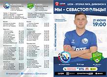 Программка к матчу 15-го тура LEON-Первенства России по футболу среди команд Второй лиги, "Дивизион Б", группа 1, сезона-2025 между "Севастополем" и "Дружбой" (Майкоп), состоявшемуся 21 июня 2025 года.